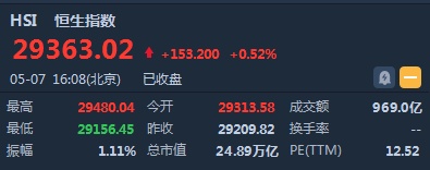 智通财经APP获悉,恒指早盘高开103.76点或0.36%,报29313.58点。截至收盘,恒生指数涨153.2点或0.52%,报29363.02点,全日成交额达969.08亿。国企指数涨0.24%,报11261.05点,红筹指数涨0.39%,报4521.52点。