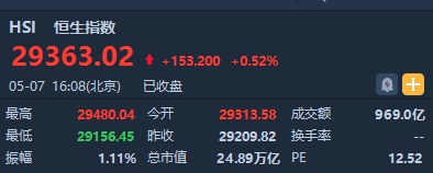 截至收盘,恒生指数涨153.2点或0.52%,报29363.02点,全日成交额达969.08亿。国企指数涨0.24%,报11261.05点,红筹指数涨0.39%,报4521.52点。