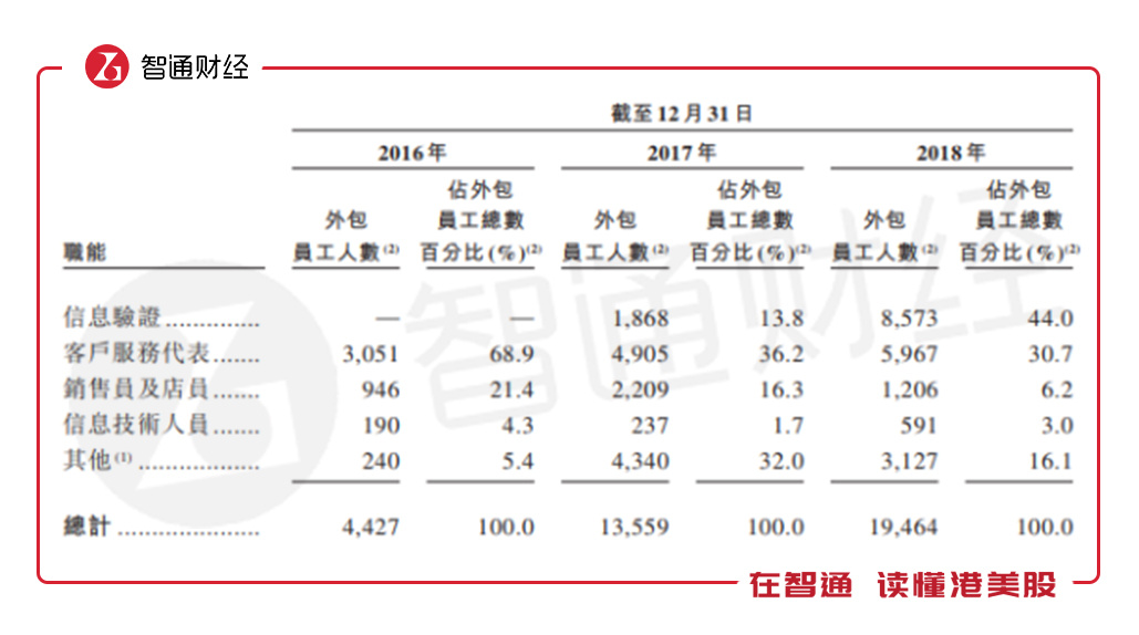 智通财经了解到,该公司外包灵活用工主要分布在四大职位,分别是信息验证、客户服务代表、销售员及店员以及信息技术人员,2018年这四大职位雇员占比达83.9%,前两项职位雇员占比74.7%,其中信息验证职位是2017年引入,2018年雇员占比跃升第一为44%。