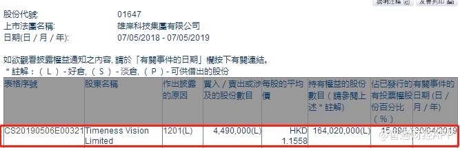 智通财经APP获悉,根据联交所资料显示,Timeness Vision Ltd于4月30日减持雄岸科技(01647)449万股,每股作价1.1558港元,总值518万港元,最新持股数目约1.64亿股,最新持股比例为15.89%。