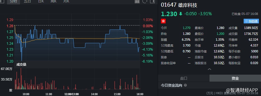 截至今日收盘,雄岸科技(01647)跌3.91%,报1.23港元。