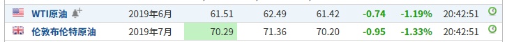 布油跌1.33%报70.29美元,WTI跌1.2%报61.51美元。现货黄金微涨0.23%报1280.85美元。