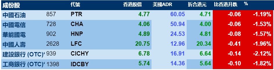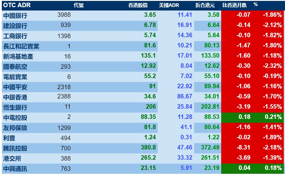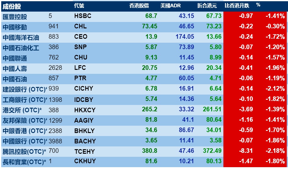 智通财经APP讯,周二美股集体大跌,港股走势还是比较动荡的,隔夜港股ADR比例指数一改周一上升势头,跟随港美股大跌。按比例计算,收报28923点,跌440.50点。其中,汇丰控股收报68.7元,较港收市跌0.97元;腾讯控股收报372.49元,较港收市跌8.31元;然而,中电控股收报88.35元,较港收市升0.18元;中兴通讯收报23.15元,较港收市涨0.04元。