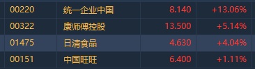 智通财经APP获悉,恒指早盘受挫,食品饮料等防御性板块逆势受追捧,截至发稿,统一(00220)涨13.06%,康师傅(00322)涨5.14%,日清食品(01475)涨4.04%,中国旺旺(00151)涨1.11%。