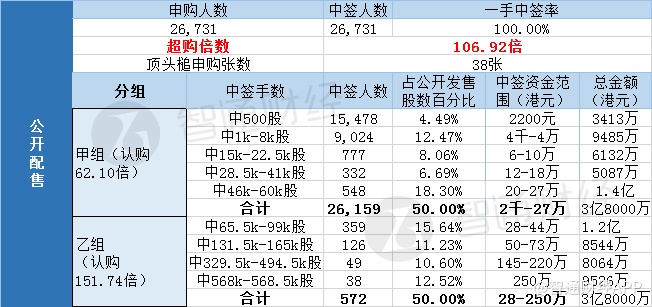 其中,公开配售申购人数26731,一手中签率100%,超购倍数106.92倍。