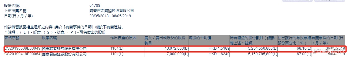 智通财经APP获悉,根据联交所资料显示,国泰君安证券于5月6日增持国泰君安国际(01788)1307万股,每股作价1.52港元,总值1986.64万港元,最新持股数目约52.54亿股,最新持股比例为68.10%。