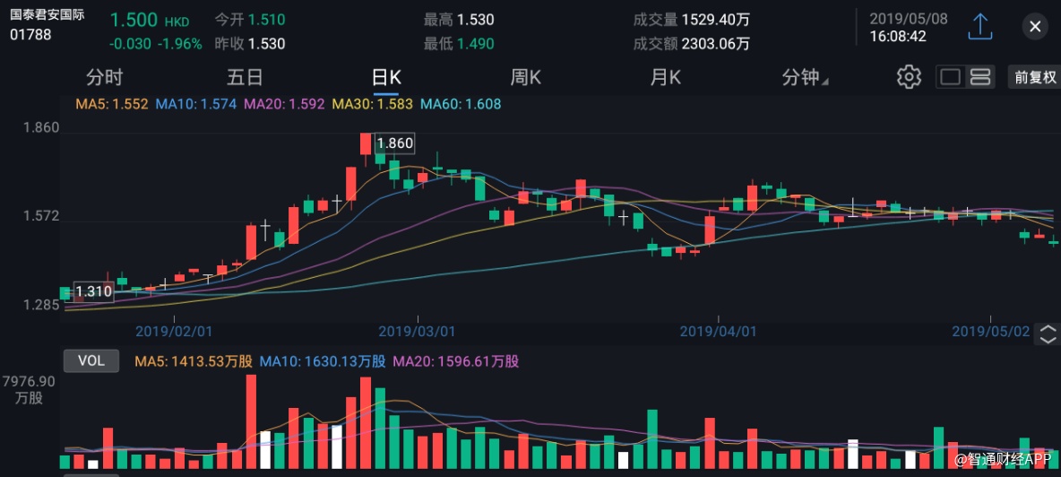 截至今日收盘,国泰君安国际(01788)跌1.96%,报1.50港元。