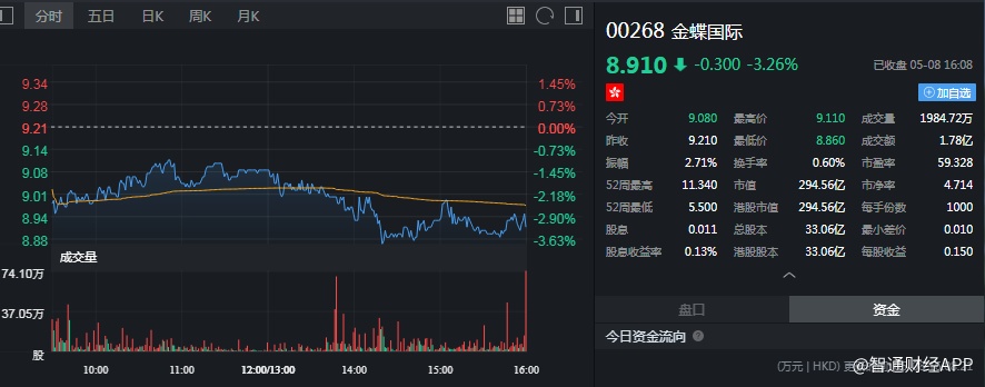 截至今日收盘,金蝶国际(00268)跌3.26%,报8.91港元。