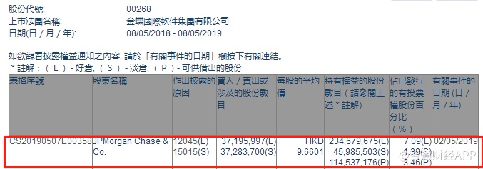 智通财经APP获悉,根据联交所资料显示,摩根大通于5月2日减持金蝶国际(00268)3719万股,每股作价9.66港元,总值约3.6亿港元,最新持股数目约2.34亿股,最新持股比例为7.09%。