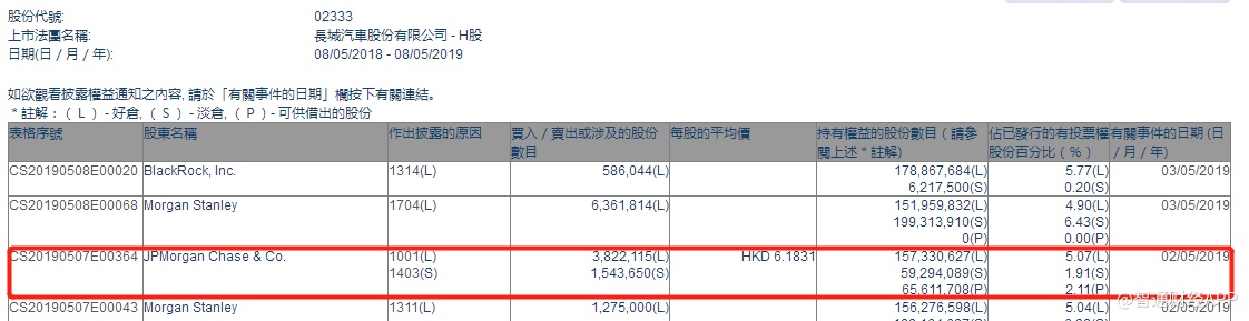 智通财经APP获悉,根据联交所资料显示,摩根大通于5月2日增持长城汽车(02333)382万股,每股作价6.18港元,总值2360.76万港元,最新持股数目约1.57亿股,最新持股比例为5.07%。