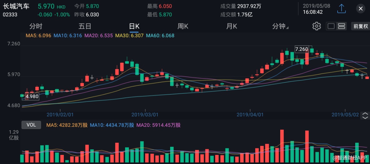 截至今日收盘,长城汽车(02333)跌1.00%,报5.97港元。