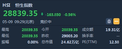 智通财经APP获悉,恒生指数开盘跌163.85点或0.56%,报28839.35点。国企指数跌0.57%,报11034.2点。红筹指数跌0.21%,报4458.84点。大市盘前成交19.31亿港元。欧股收涨,美股尾盘回落。原油收高,金价终结三连涨。