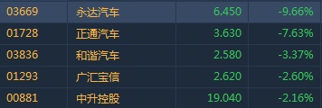 智通财经APP获悉,据乘联会发布的数据显示,4月国内乘用车总体批发量达到日均4.38万台,同比下降22%,不及市场预期。汽车经销商股集体大跌,截至10时54分,永达汽车(03669)跌9.66%,报价6.45港元,正通汽车(01728)跌7.63%,和谐汽车(03836)跌3.37%,广汇宝信(01293)跌2.6%。