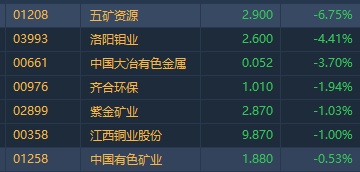 智通财经APP获悉,铜板块近期持续回调,今日再度走低,截至发稿,五矿资源(01208)跌6.75%,洛阳钼业(03993)跌4.41%,紫金矿业(02899)跌1.03%。