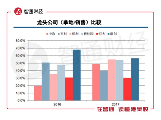 公司全年花费951.2亿元购入76宗土地项目,拿地金额同比增长133.8%,拿地面积达1741.4万平方米,权益面积达1463万方,同比增长79.2%。加上控股子公司中海宏洋94亿的拿地金额,中海2017年共拿地1045.18亿,拿地/销售回升至50%以上,追齐各大龙头房企。