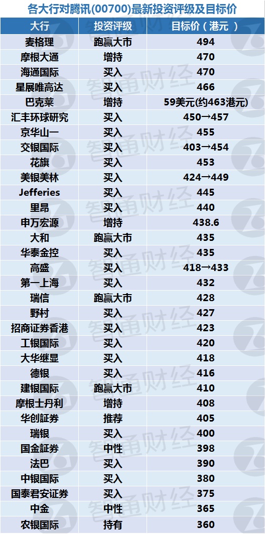 一、各大行对腾讯(00700)最新投资评级及目标价: