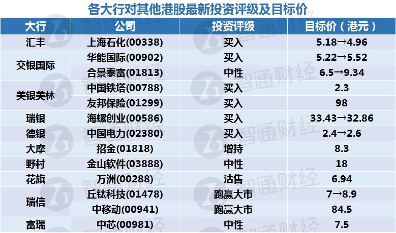 五、各大行对其他港股最新投资评级及目标价: