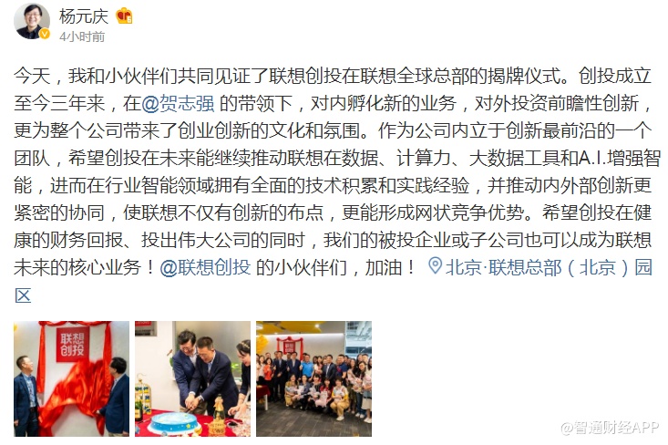 智通财经APP获悉,今日,联想集团(00992)董事长兼CEO、首席产品经理杨元庆在其官微发文称联想创投在联想全球总部正式揭牌。