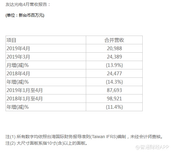 智通财经APP获悉,全球领先的薄膜电晶体液晶显示器(TFT- LCD) 研发及制造公司友达光电(AUO.US)公布2019年4月自行结算合并营收为新台币209.9亿元,较上月减少13.9%,较去年同期下降14.3%。