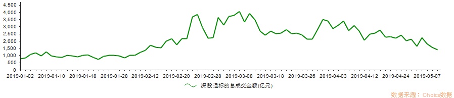 市场大幅回调,除了资金流出,还伴随着成交逐渐萎缩。沪指5月6日大跌5.58%,此后几日互通渠道的成交额便逐渐萎缩,难以与二三月份行情火爆时相提并论。