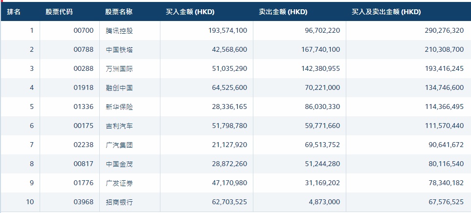 结合今日的港股通(沪)、港股通(深)前十大活跃成交看,成交比较活跃的有腾讯(00700)、吉利汽车(00175)以及万洲国际(00288)等。