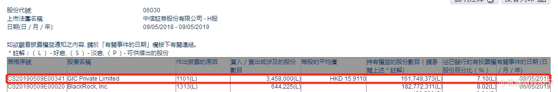 智通财经APP获悉,根据联交所资料显示,GIC Private Ltd于5月8日增持中信证券(06030)345万股,每股作价15.91港元,总值5488.95万港元,最新持股数目约1.61亿股,最新持股比例为7.10%。