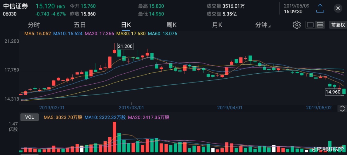 截至今日收盘,中信证券(06030)跌4.67%,报15.12港元。