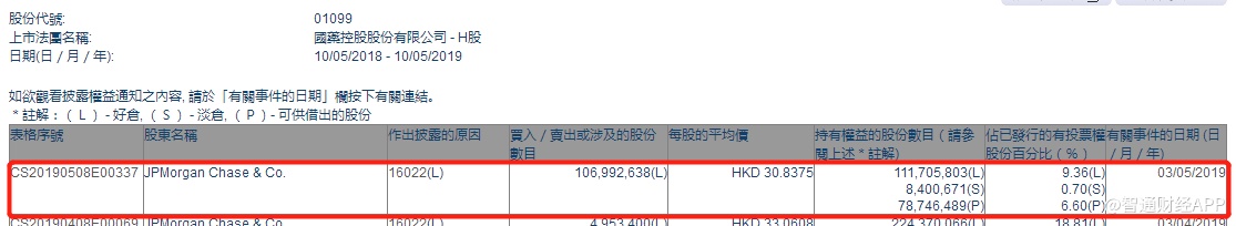 智通财经APP获悉,根据联交所资料显示,摩根大通于5月3日减持国药控股(01099)1.06亿股,每股作价30.84港元,总值约32.69亿港元,最新持股数目约1.11亿股,最新持股比例为9.36%。