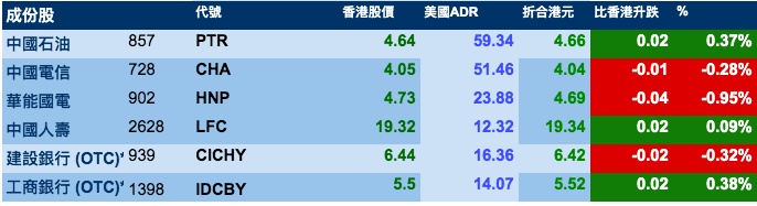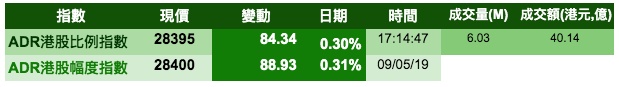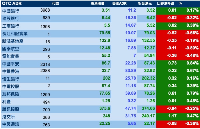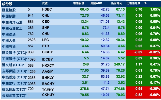 智通财经APP获悉,周四美股尾盘跳水,标普四连阴,港股ADR指数却截然不同,小幅反弹回升,按比例计算,收报29313点,升84.34点。大型蓝筹全线靠稳,汇丰控股收报67.15元,较港收市升0.7元;腾讯控股收报374.66元,较港收市跌0.94元。