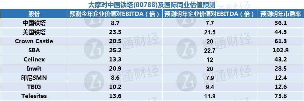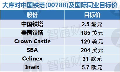 大摩同时还列出了中国铁塔(00788)及国际同业目标价及估值预测(表):