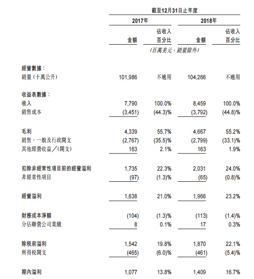 招股书显示,百威亚太2017年、2018年收入分别为77.9亿美元及84.59亿美元;毛利分别43.39亿美元及46.67亿美元,毛利率分别为55.7%及55.2%;期内溢利分别为10.77亿美元及14.09亿美元,净利率分别为13.8%及16.7%。