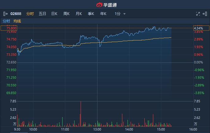 智通财经APP获悉,早盘高开后震荡走高,截至15时18分,涨4.34%,报75.8港元,成交额达1.352亿港元。