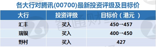 一、各大行对腾讯(00700)最新投资评级及目标价: