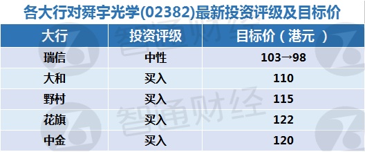 二、各大行对舜宇光学(02382)最新投资评级及目标价: