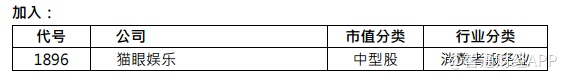 恒生综合大中型股指数纳入猫眼娱乐,成份股数目将由 303 只增加至 304。