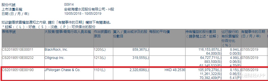 智通财经APP获悉,根据联交所资料显示,摩根大通于5月7日增持海螺水泥(00914)232万股,每股作价48.25港元,总值约1.12亿港元,最新持股数目约1.05亿股,最新持股比例为8.15%。