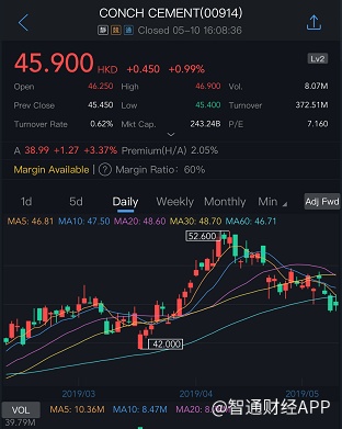 截至今日收盘,海螺水泥(00914)涨0.99%,报45.9港元。
