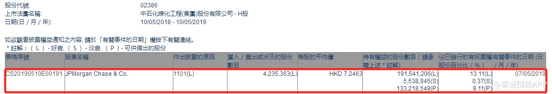 智通财经APP获悉,根据联交所资料显示,摩根大通于5月7日增持中石化炼化工程(02386)423万股,每股作价7.25港元,总值约3066.75万港元,最新持股数目约1.91亿股,最新持股比例为13.11%。