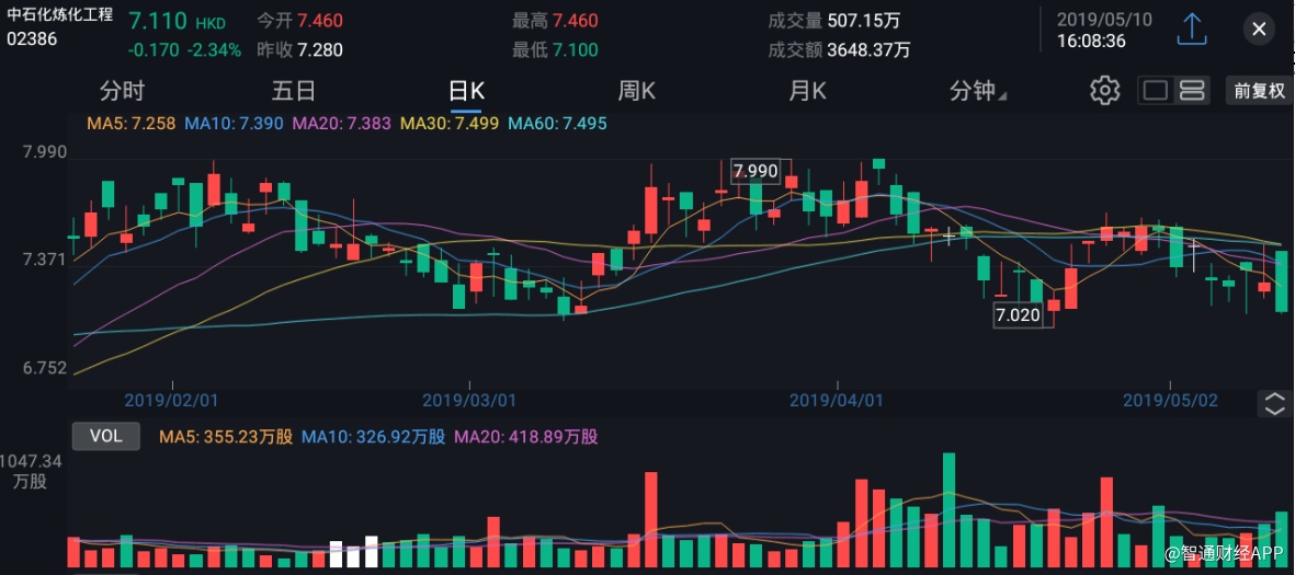 截至今日收盘,中石化炼化工程(02386)跌2.34%,报7.11港元。