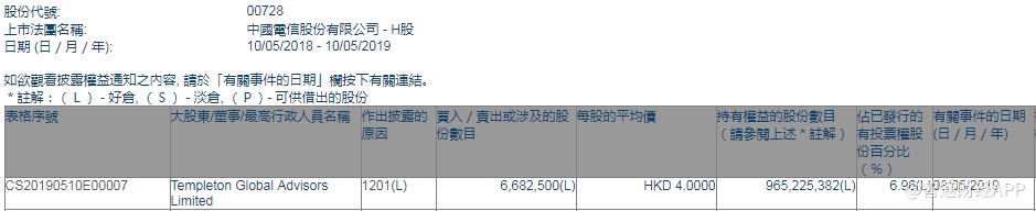 智通财经APP获悉,根据联交所资料显示,Templeton Global Advisors Ltd于5月8日减持中国电信(00728)668万股,每股作价4港元,总值约2672万港元,最新持股数目约9.65亿股,最新持股比例为6.96%。