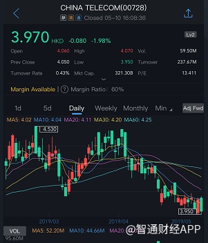 截至今日收盘,中国电信(00728)跌1.98%,报3.97港元。
