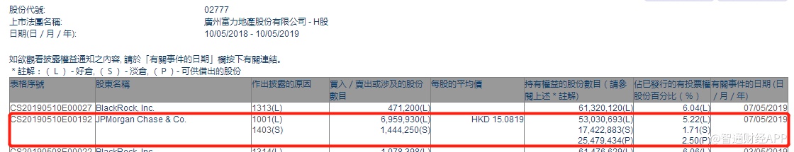 智通财经APP获悉,根据联交所资料显示,摩根大通于5月7日增持富力地产(02777)695万股,每股作价15.08港元,总值约1.05亿港元,最新持股数目5303万股,最新持股比例为5.22%。
