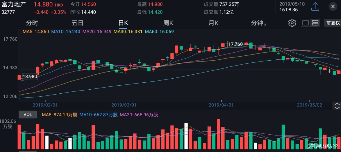 截至今日收盘,富力地产(02777)涨3.05%,报14.88港元。