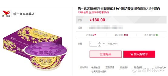 智通财经APP观察到,统一的满汉宴方便面6碗装网售价格180元,康师傅(00322)的express系列网售单价也达到约25元。