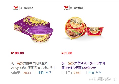 为了验证利润增长的来源,智通财经APP统计了几款新产品在天猫商城的销售数据,从2018年1月份开始到现在,自热火锅总销量约15000份,月均销售不足1000份;自热米饭月55000份,月均大概3900份;而前面提到的高端方便面“满汉”系列,总销量只有2000多份,满汉大餐月均销售780份,满汉宴月均销售只有77份。