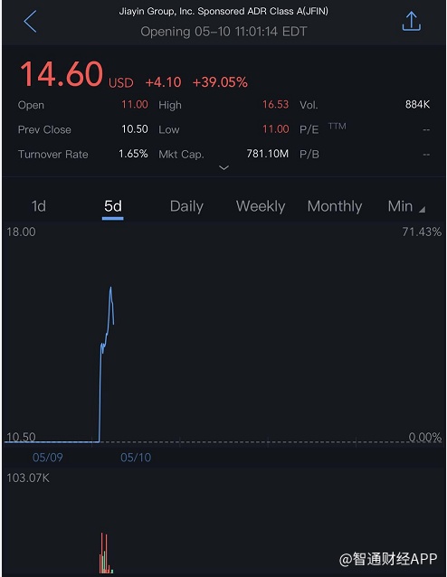 智通财经APP获悉,5月10日,你我贷母公司嘉银金科(JFIN.US)上市首日盘初大涨,首日开盘报11.00美元,IPO发行价为10.50美元/ADS。