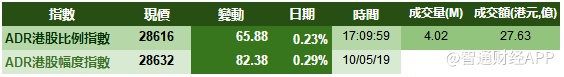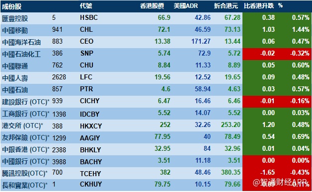 智通财经APP获悉,隔夜美股反弹,刺激港股ADR指数全日走强,按比例计算,收报28616点,升66点。汇丰控股收报67.28元,较港收市升0.38元;腾讯控股收报380.35元,较港收市跌1.65元。