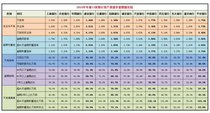 继续当数据搬运工,统计分析一下各家银行不良系列指标存量情况。通过对12家主要大中型银行的2018年年报数据对比分析,从纵向看银行资产质量静态数据总体在好转,从横向对比我们用了15个存量指标,总的来说四大行、招商银行和重农商行数据要好于股份制银行,招商银行和建设银行最好,民生银行和平安银行最弱。有兴趣可以详细看表,重点指标对比分析如下: