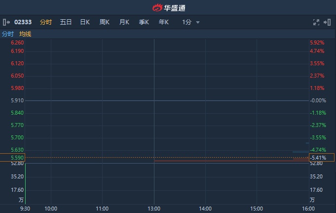 智通财经APP获悉,长城汽车(02333)早盘大幅低开,截至9时20分,跌5.41%,报5.59港元,成交额达295.15万港元。