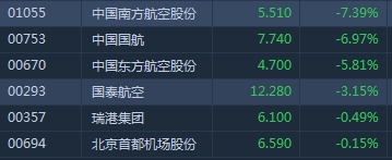 智通财经APP获悉,受汇率影响,航空股全线走弱。截至11时21分,南航(01055)跌7.39%,报价5.51港元,国航(00753)跌6.97%,东航(00670)跌5.81%,国泰航空(00293)跌3.15%。